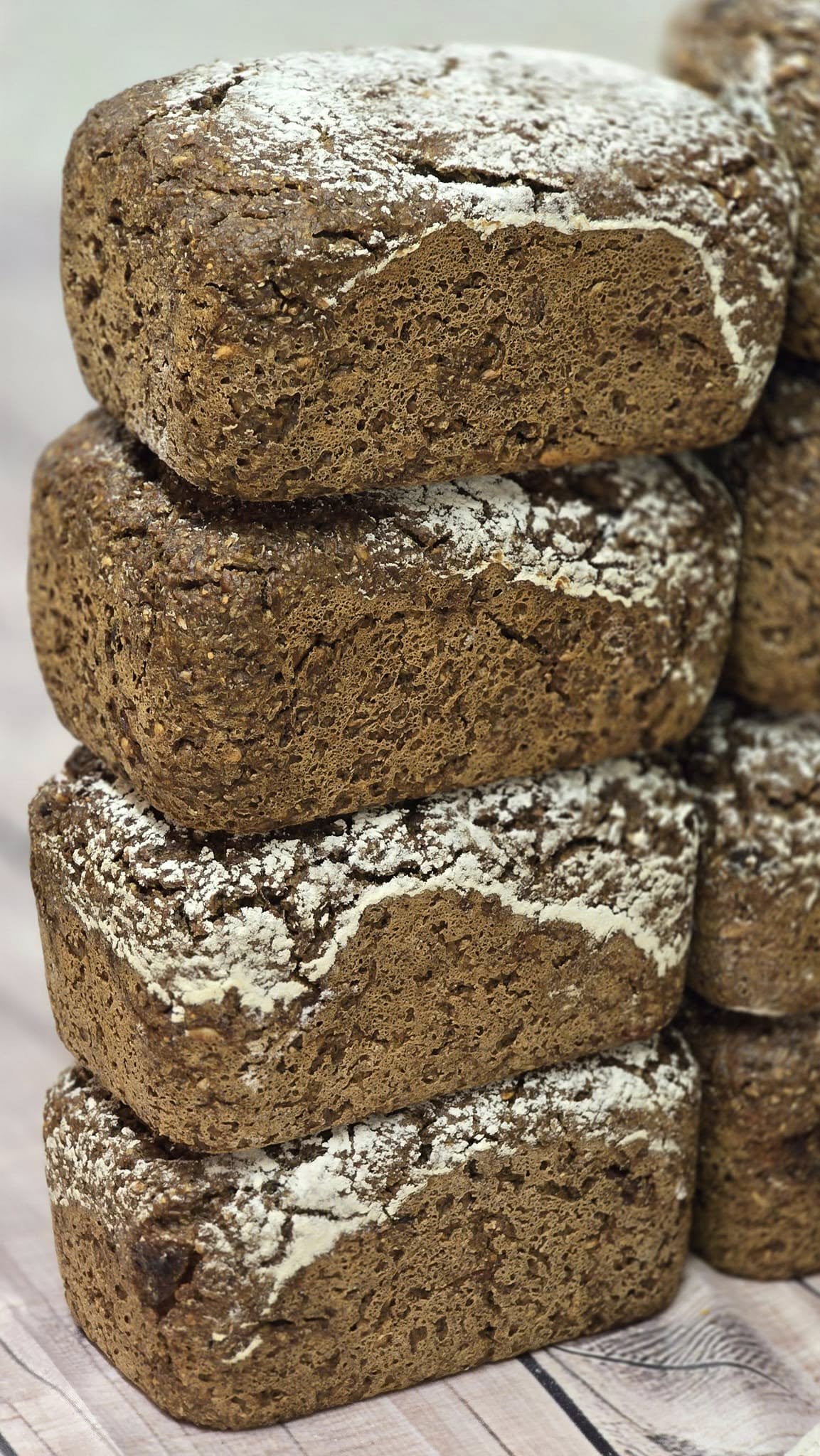 Det andre brødet, som er min favoritt, er eit rugbrød baka med heile korn, surdeig og ei blanding av tørka frukt: svisker, aprikosar, fersken, fiken, rosiner og ulike frø. Det er eit tett og rikt brød, mørkt, saftig og fullt av små overraskingar i kvar skive. Frukta gjev naturleg sødme, medan frøa løftar både smaken og strukturen.