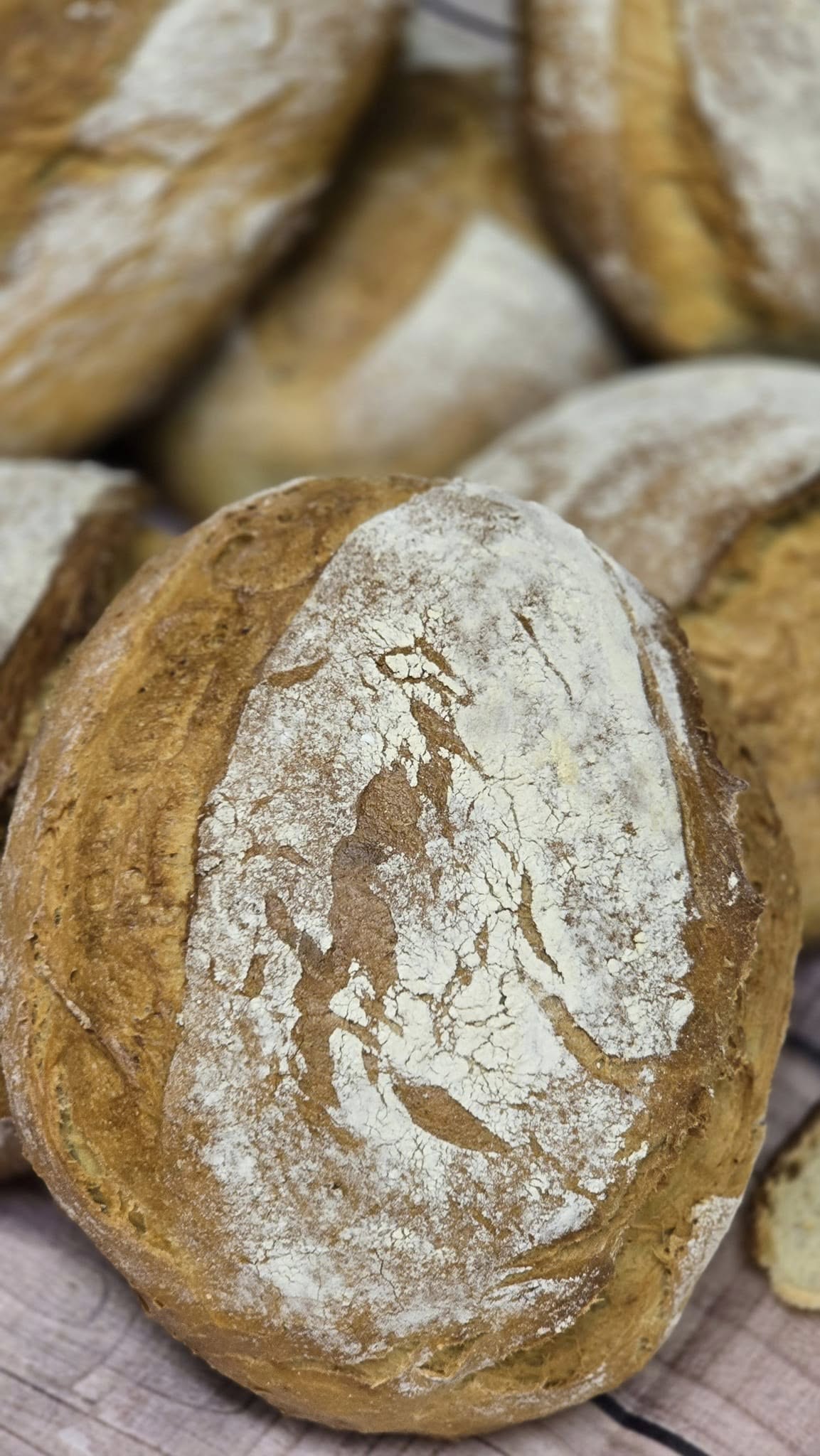 Det første brødet er laga med to surdeigar, ein rugsurdeig og ein speltsurdeig. Mjølet er aromatisk, sikta og fint male. Det gjev eit brød med roleg karakter, men med mykje djupn i smaken, og med den fine speltaromaen som gjer at ein straks kjenner att kva slags korn ein har med å gjere.